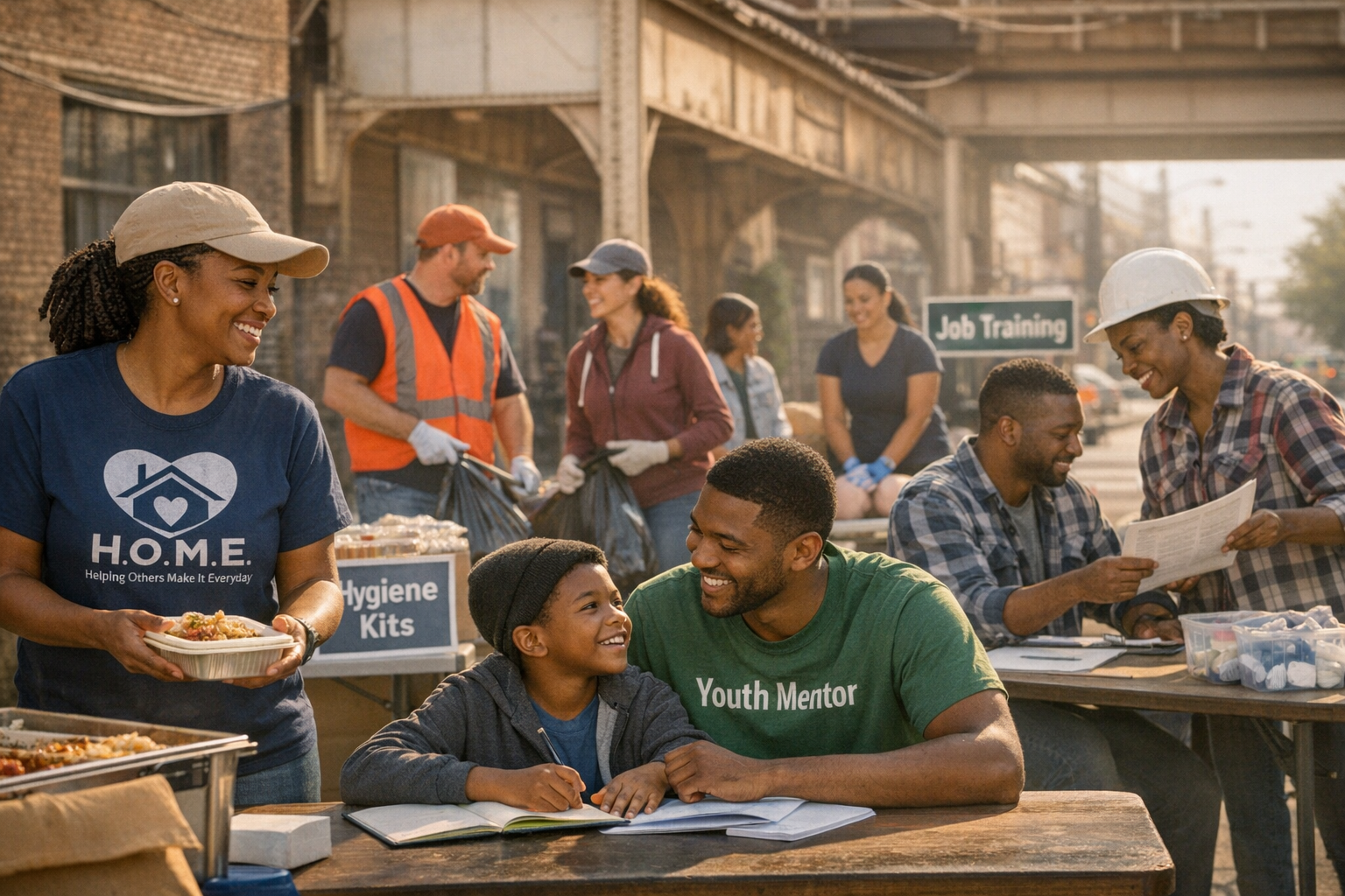 Helping Others Make It Everyday NFP(H.O.M.E) is a Chicago-based nonprofit dedicated to empowering underserved individuals and families through direct service, community safety initiatives, youth development, and job readiness programs. H.O.M.E exists to meet immediate needs while creating pathways to long-term stability, resilience, and self sufficiency.